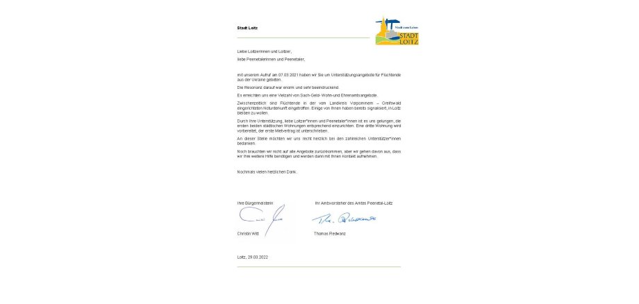 Durch Ihre Unterstützung, liebe Loitzer*innen und Peenetaler*innen ist es uns gelungen, die ersten beiden städtischen Wohnungen entsprechend einzurichten. Eine dritte Wohnung wird vorbereitet, der erste Mietvertrag ist unterschrieben.