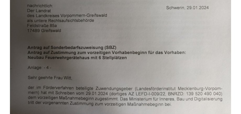 Ein weiterer Meilenstein ist geschafft – am 29.01.2024 erhielt die Stadt Loitz auf ihre Anträge von November 2023 hin, die Zustimmungen zum vorzeitigen Maßnahmebeginn sowohl vom Landesförderinstitut, als auch vom Ministerium für Inneres, Bau und Digitalisierung Mecklenburg - Vorpommern für das Vorhaben „Neubau eines Feuerwehrgerätehauses mit 6 Stellplätzen in 17121 Loitz“. Bereits mit Datum vom 04.01.2024 erteilte der Landkreis Vorpommern- Greifswald die erforderliche Baugenehmigung.