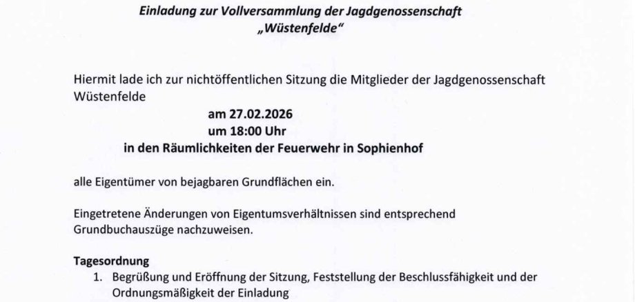 Einladung zur Vollversammlung der Jagdgenossenschaft "Wüstenfelde"